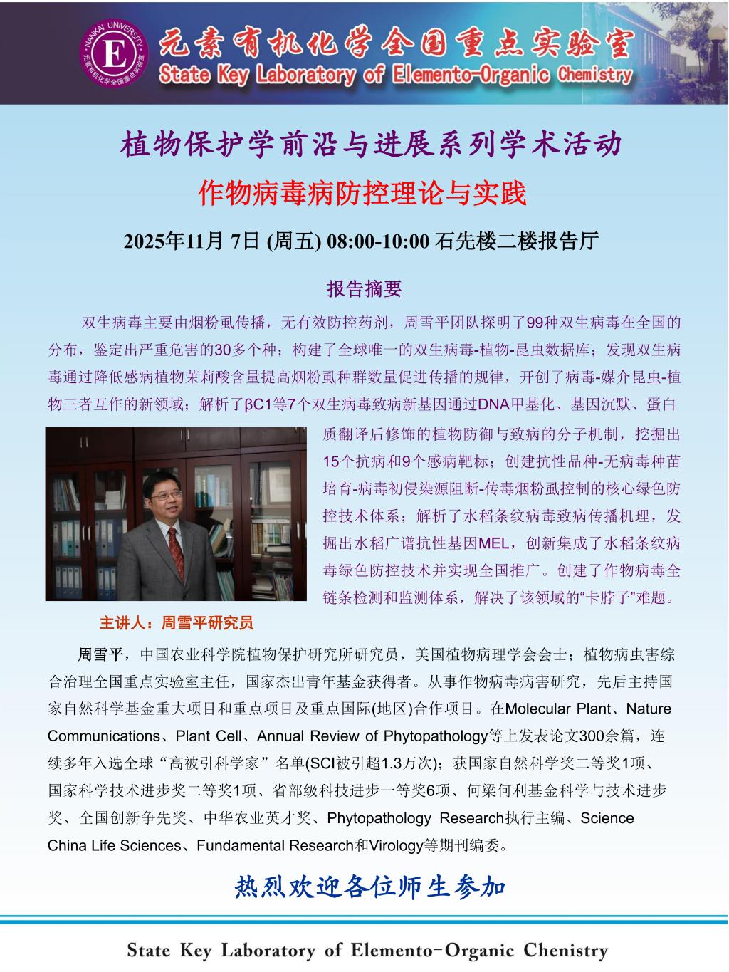 应元素有机化学全国重点实验室及植物保护学科邀请,中国农业科学院植物保护研究所 周雪平 研究员 访问重点实验室并于11月7日(周五)上午8:00在石先楼二楼学术报告厅作植物保护学前沿与进展系列学术报告,详细信息如下: