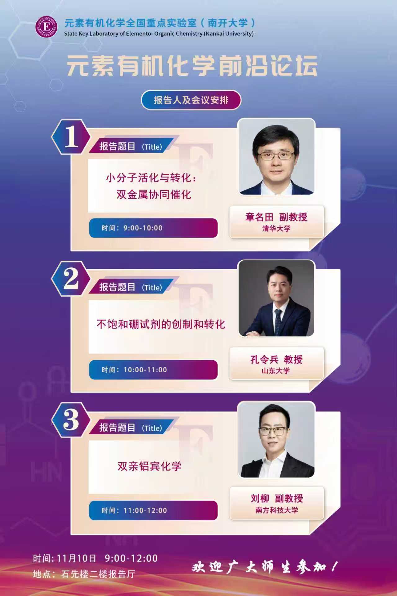 应元素有机化学全国重点实验室莫贞波研究员邀请,清华大学章名田、南方科技大学刘柳、山东大学孔令兵三位老师访问重点实验室并于11月10日(周一)上午9:00在石先楼二楼学术报告厅作元素有机化学前沿论坛系列学术报告,详细信息如下: