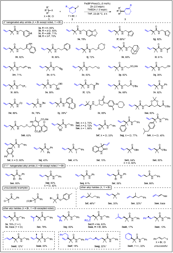图2. 铁催化3º C(sp³)-1º/2º C(sp³)还原交叉偶联反应底物范围