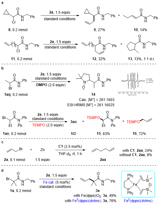 在前期工作基础上,该课题组近期实现了铁催化下羰基导向的三级烷基卤代物与烯丙基卤代物的还原交叉偶联反应,高效构建了季碳中心(图1d)。初步机理研究表明,羰基基团的导向作用有效协助铁催化剂克服了底物空间位阻大、竞争副反应多等不利因素,成为反应成功的关键。该研究成果近期发表于Nature Communications(2025, 16, 9804),张乔博士为论文第一作者,朱守非教授为通讯作者。