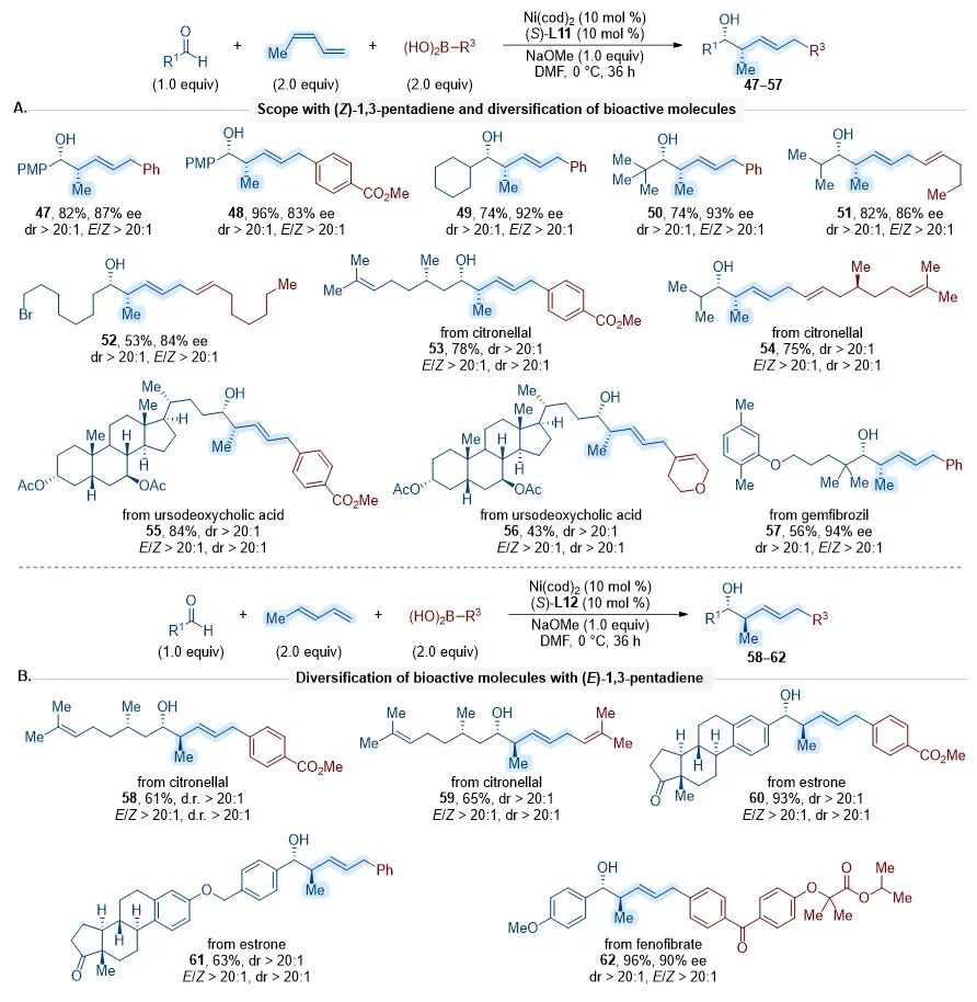 图4. (Z)-1,3-戊二烯参与的多组分反应以及复杂底物的适用范围。图片来源:J. Am. Chem. Soc.