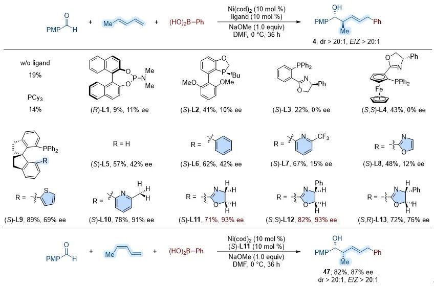 为实现上述反应,作者首先评估了多种常见手性配体,包括BINOL衍生的磷酰胺酯(L1)、BI-DIME(L2)、PHOX(L3)、Ph-FOXAP(L4)和螺环膦配体(L5)。这些配体仅在产率和对映选择性方面带来有限提升(图2)。作者由此推测,若在刚性配体骨架中引入非共价相互作用位点,或可更加精准地调控对映选择性。基于这一设想,他们进一步筛选了含有不同非共价π相互作用位点的螺环膦配体(L6–L9),如苯基(L6)、2-三氟甲基吡啶(L7)、噁唑(L8)和噻吩(L9)。虽然这些配体在一定程度上提高了反应的产率或对映选择性,但整体表现仍不理想(均低于69% ee)。值得一提的是,当在配体结构中同时引入π和sp3 C–H相互作用位点(L10–L13),如6-甲基吡啶(L10)和噁唑啉(L11)等后,反应表现显著提升,对映体过量(ee)超过91%。其中,苯基取代的配体[(S,S)-L12]表现最为突出,以82%的产率和93% ee得到目标产物,显示出精准调控配体非共价相互作用对于镍催化多组分反应立体选择性的重要影响。进一步,将(Z)-1,3-戊二烯作为底物,能以高产率及优异的非对映选择性和对映选择性合成syn-2-烯基-4-甲基-5-烷氧基结构。