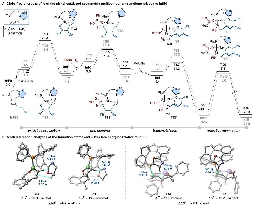 进一步的DFT计算结果表明,二烯与醛在Ni(0)催化下经过氧化环化生成镍杂环及其后续开环过程均为可逆反应。如图6所示,对比氧化环化(TS3/TS4)、开环(TS5/TS6)和转金属化(TS7/TS8)等关键步骤的最低能量过渡态,明确了主、次对映体[(R,R)与(S,S)]的形成路径。TS3与TS4之间(–0.9 kcal/mol),TS5与TS6之间(0.7 kcal/mol)的能垒差异较小,说明这两个步骤对对映选择性的影响有限。相反,转金属化的过渡态(TS7/TS8)能量差达到2.0 kcal/mol,成为对映选择性的决定步骤。由于氧化环化和开环是可逆过程,转金属化则是整个催化循环中的第一个不可逆步骤,因此对映选择性主要在此阶段确立,这也与实验结果相符。进一步的非共价相互作用分析显示,配体中的噁唑啉单元在氧化环化和转金属化中具有双重作用:既作为π-受体,又作为C–H供体,显著降低了反应的活化能垒。
