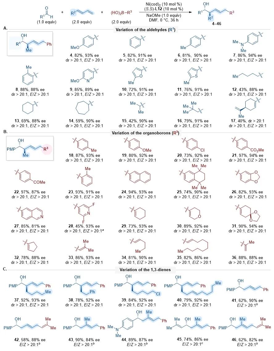 在优化反应条件确立后,作者对该反应体系的底物适用性进行了系统考察(图3)。研究结果显示,该多组分反应对多种醛类底物,包括芳香醛、杂芳醛、脂肪醛及不饱和醛,均具有良好适用性。同时,各类芳基硼酸、杂芳基硼酸、环状及非环状烯基硼酸,以及多种工业常见的1,3-二烯(如1,3-丁二烯和异戊二烯)等底物亦能顺利参与反应。该体系普遍能够以中等至优良的收率获得目标产物,并表现出优异的立体选择性和区域选择性。