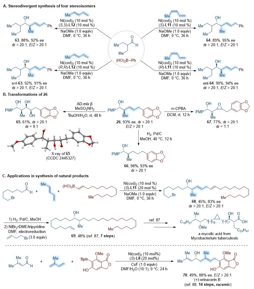 鉴于二烯的几何构型可调控反应的非对映选择性,作者通过将不同对映体的配体与特定构型的二烯匹配,实现了2-烯基-4-甲基-5-烷氧基结构单元的立体发散性合成(图5)。此外,产物经衍生化后可获得氧化或还原型的手性聚酮结构单元。为展示该反应的合成应用价值,作者还将多组分偶联反应应用于结核分枝杆菌分枝菌酸关键中间体和天然产物(+)-erinacerin B的高效合成,显著提升了整体合成效率。