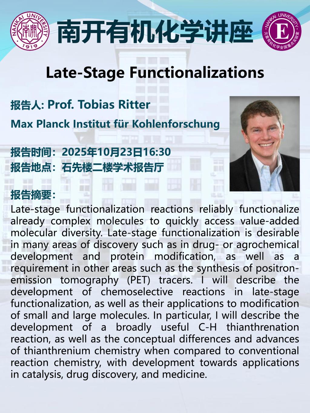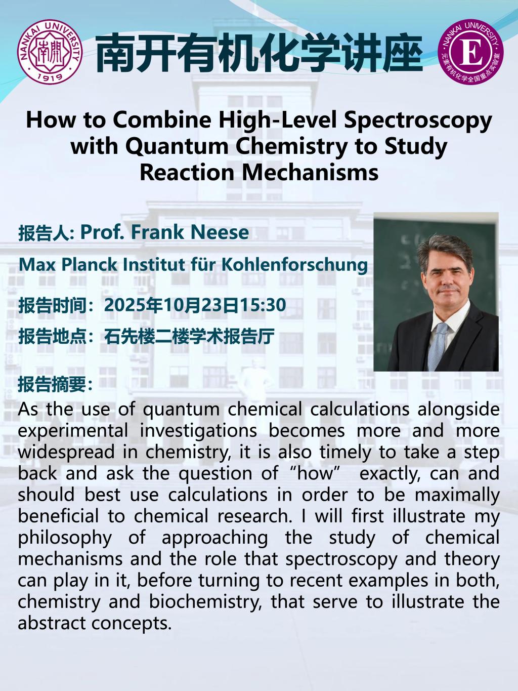 应元素有机化学全国重点实验室邀请,德国马克斯·普朗克研究所 Frank Neese 教授和Tobias Ritter 教授将于10月23日( 周四)以南开有机化学讲座报告人身份访问重点实验室并作学术报告,以下是详细信息: