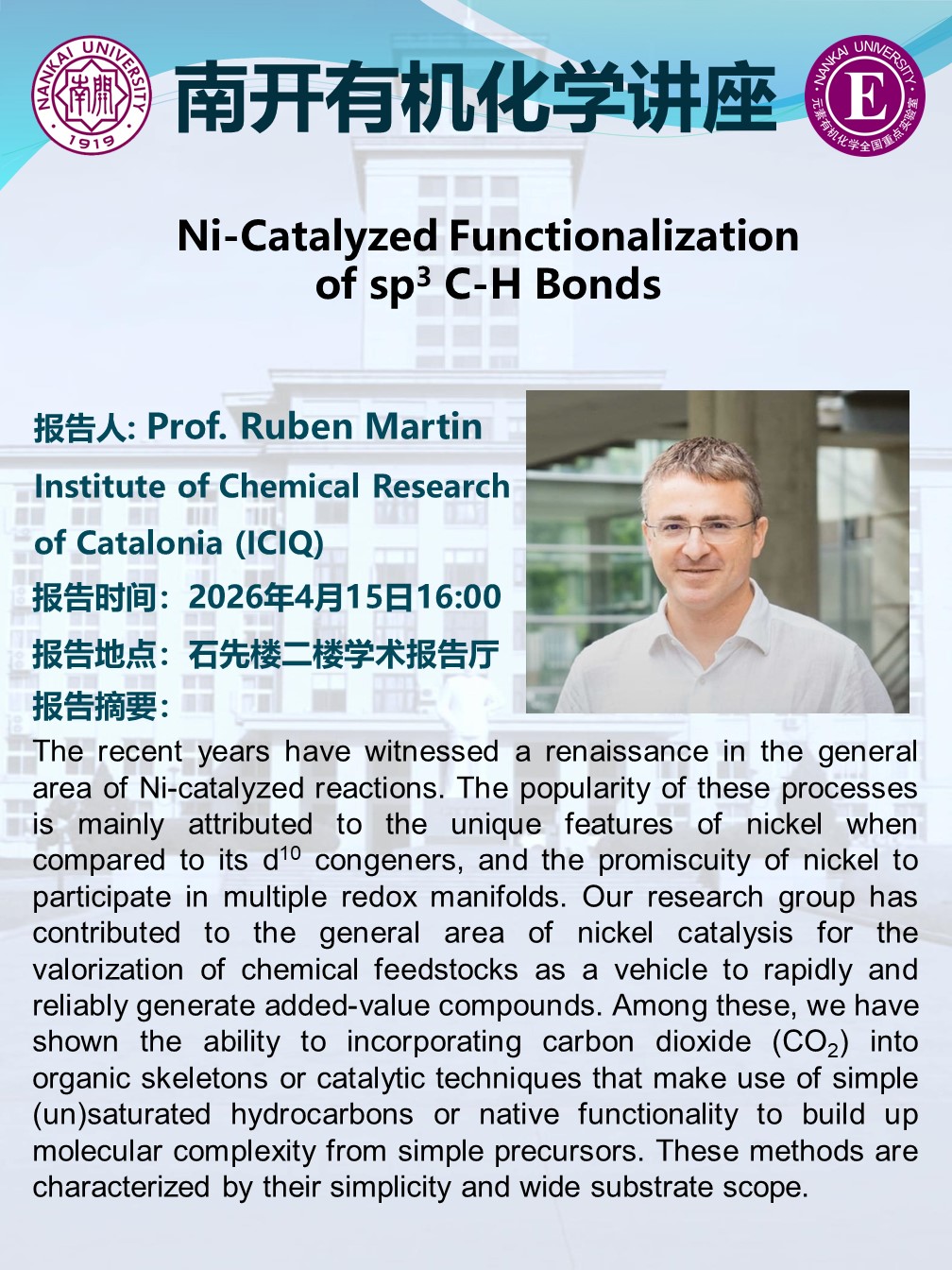 应元素有机化学全国重点实验室邀请,西班牙加泰罗尼亚化学研究所 Ruben Martin 教授将于4月15日以南开有机化学讲座报告人身份访问重点实验室并作学术报告,以下是详细信息: