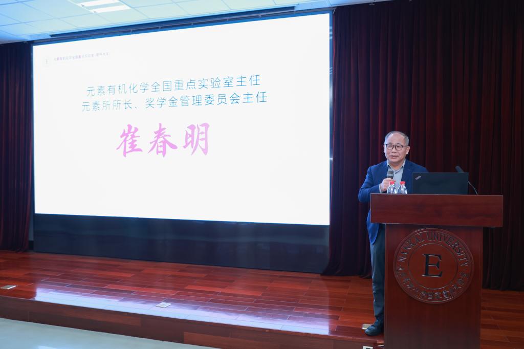 会议伊始,元素有机化学全国重点实验室主任、元素所所长、奖学金管理委员会主任崔春明发表致辞。他首先对莅临现场的企业嘉宾、学校领导表示热烈欢迎,向万香科技股份有限公司、武汉中科牛津波谱技术有限公司、梯希爱(上海)化成工业发展有限公司的慷慨捐资致以诚挚敬意,向全体获奖同学送上热烈祝贺。崔春明表示,元素有机化学全国重点实验室始终以人才培养为核心,深耕有机化学领域的科研与育人工作,校企合作是推动人才培养高质量发展的重要动力。