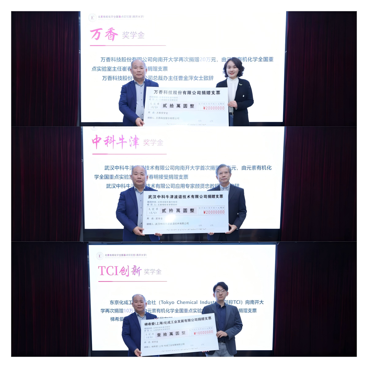 在捐赠仪式环节,万香奖学金、中科牛津奖学金以及TCI创新奖学金的捐赠方代表分别上台致辞,并完成捐赠仪式。各方均表达了对南开大学元素所科研与教育工作的持续支持,并期待获奖学子在未来取得更大成就。