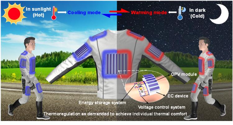 为了适应快速更迭的应用需求,陈永胜带领团队继续在有机光伏电池应用场景方面系统展开研究。他们基于柔性有机光伏和高分子电卡器件,设计制备了一种新型高效能量自持人体温度管理系统,实现了双向主动的人体热管理。谈及这项研究的初衷,陈永胜描绘了一个动人的愿景:“如果可以实现在太阳下制冷,在黑夜里保暖,并且可以利用无限和无处不在的太阳能来实现上述全天候和自持续的人体热管理,我们人类的生存空间将获得极大的扩展。”
