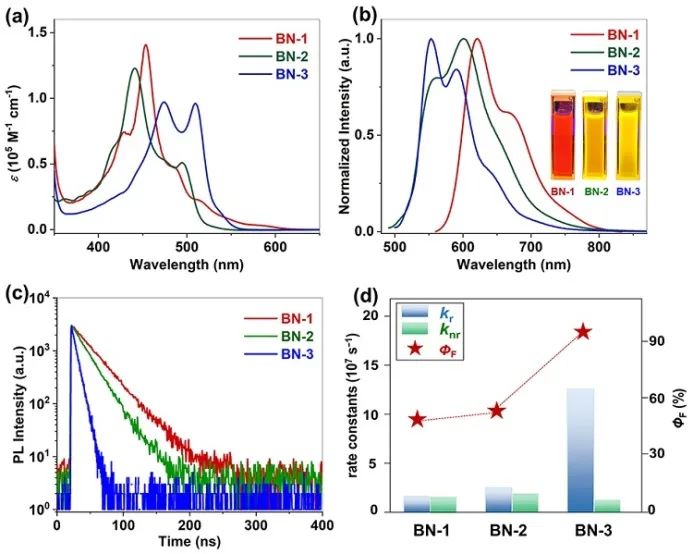 图5. 硼氮杂并九苯的光物理性质表征。(a)吸收光谱;(b)荧光光谱;(c)荧光寿命;(d)辐射速率