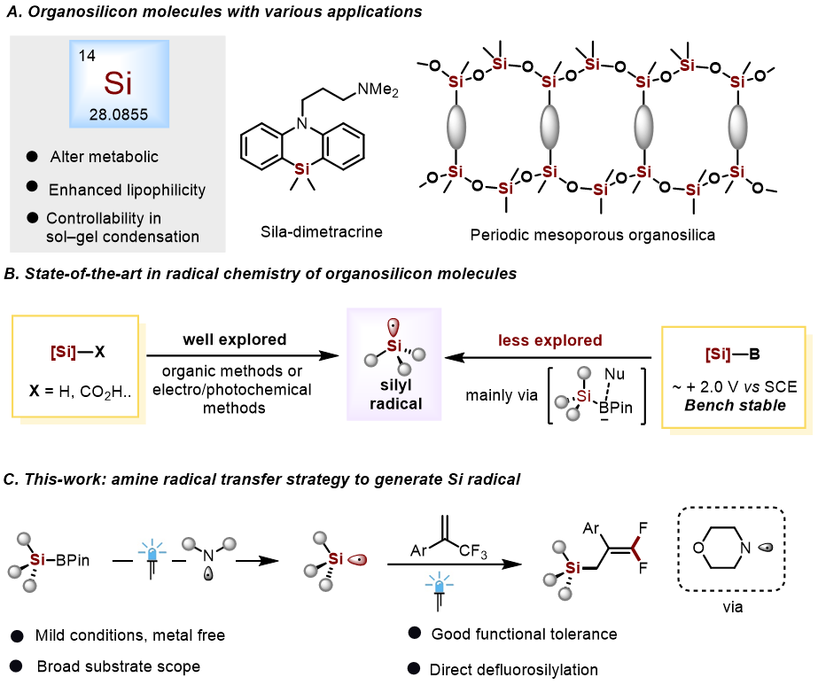 硅衍生物在作为关键原料在相关领域内至关重要,但硅硼酸频哪醇酯的高氧化电位限制了其光催化硅烷化应用。传统方法依赖亲核试剂降低电位,而胺自由基作为一种创新策略,展现出活化Si–B键的潜力,为绿色合成提供新途径。但目前含硅和偕二氟烯基片段在多数化合物中独立存在,而两者独特的构型及其在药物化学中的应用前景,将其引入同一分子将为药物化学家提供全新的研究视角。