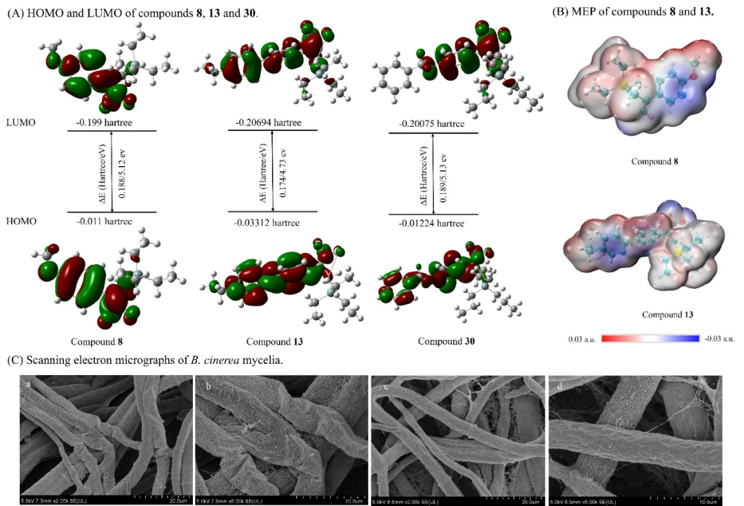 作者开发了一种通过胺自由基对硅硼酸频哪醇酯的均裂取代反应高效生成硅基自由基,并同时引入偕二氟烯基片段。该方法在温和条件下可规模化合成含硅二氟烯烃化合物,并展现出优异抗真菌活性:在50 μg/mL下对灰霉病菌等病原菌抑率>60%,EC50值优于或相当于商业杀菌剂。理论计算(DFT/MEP)揭示高活性化合物具有独特电子特性,扫描电镜证实其有效抑制菌丝生长。该工作为开发结构优化、机制新颖的杀菌剂提供了创新先导化合物。
