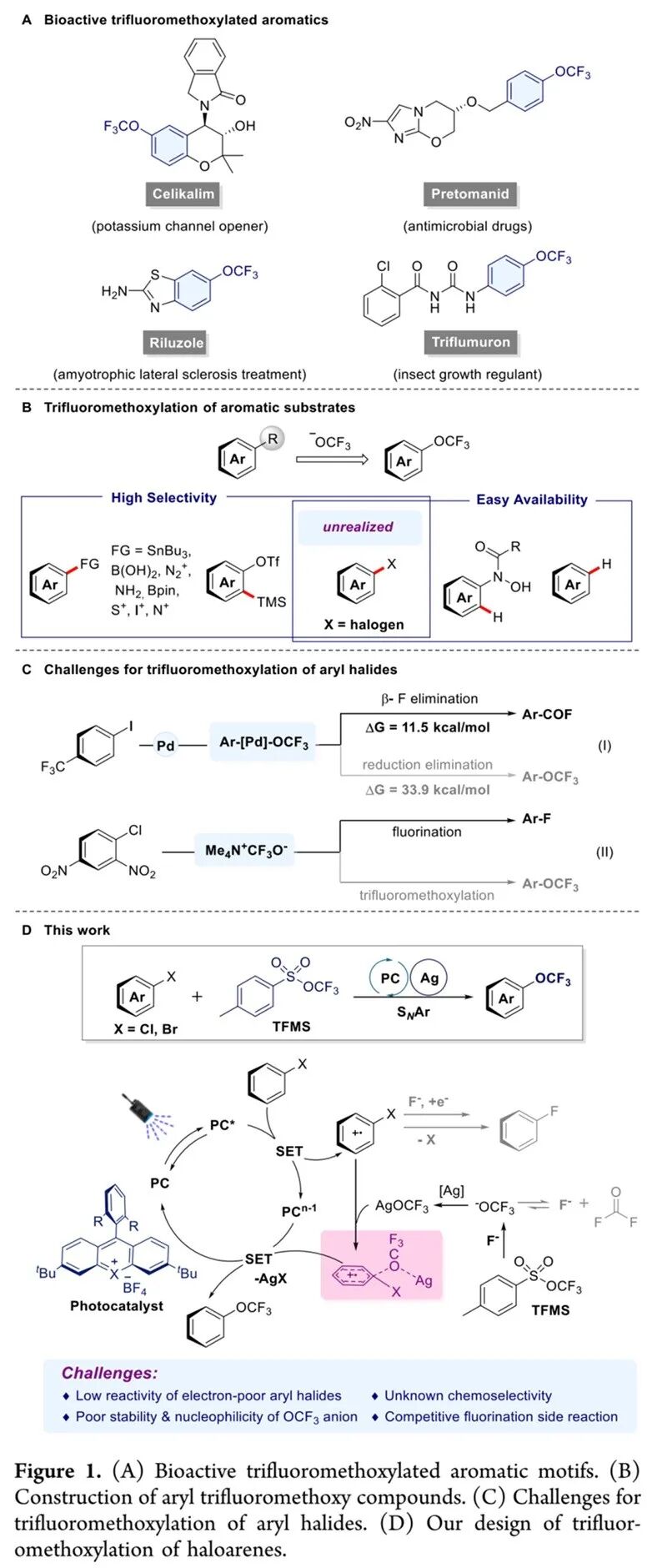 在众多潜在底物中,芳基卤化物(Ar-X)因其商业可得、稳定且易于实现区域选择性控制,被视为最理想的原料之一。但令人遗憾的是,几十年来,芳基卤化物的直接三氟甲氧基化反应始终无法实现。传统方法面临两大问题:(1)OCF3自由基倾向于进攻芳环C-H键,而非更强的C-X键。(2)弱亲核性的OCF3阴离子难以与芳基卤化物直接发生传统的芳香亲核取代反应。过渡金属(如钯)催化,会快速地发生β-氟消除而得到酰氟产物,而非三氟甲氧基产物(Figure 1 C)。