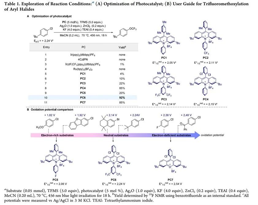 经过系统的条件优化,作者发现,对于不同电性的底物,光敏剂的选择至关重要:PC5用于富电子的芳基卤代物;PC6用于电中性的芳基卤代物;PC7则适用于缺电子的芳基卤代物(Table 1)。