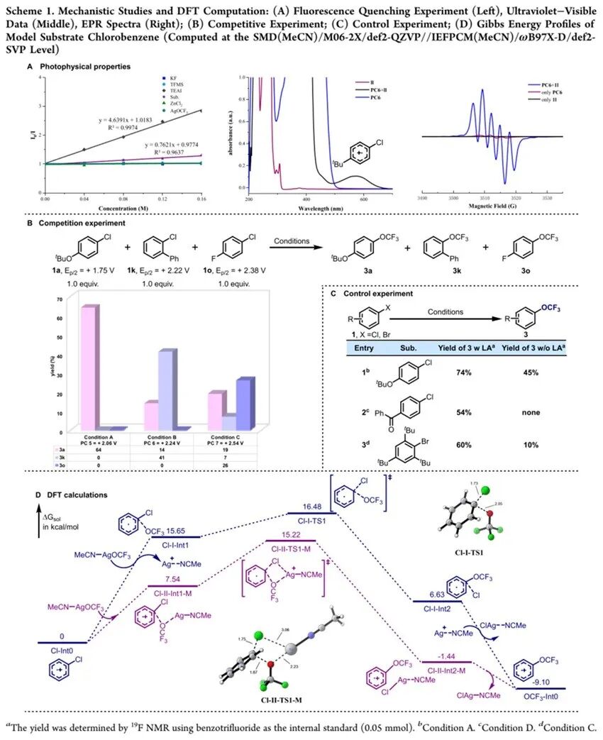 基于荧光淬灭实验、紫外光谱、EPR实验、控制实验及DFT理论计算等机理实验,作者提出:OCF3阴离子对氯苯阳离子自由基的亲核进攻可通过 SNAr 路径进行,能垒为 16.48 kcal/mol;与单分子乙腈配位的桥连银离子,可同时与离去基团 Cl 及 OCF3配位,使能垒降至 15.22 kcal/mol;当考虑双分子乙腈配位时,过渡态能垒进一步降至 14.80 kcal/mol。这些结果,证实了银盐在促进卤素离去过程中的关键作用(Scheme 1)。
