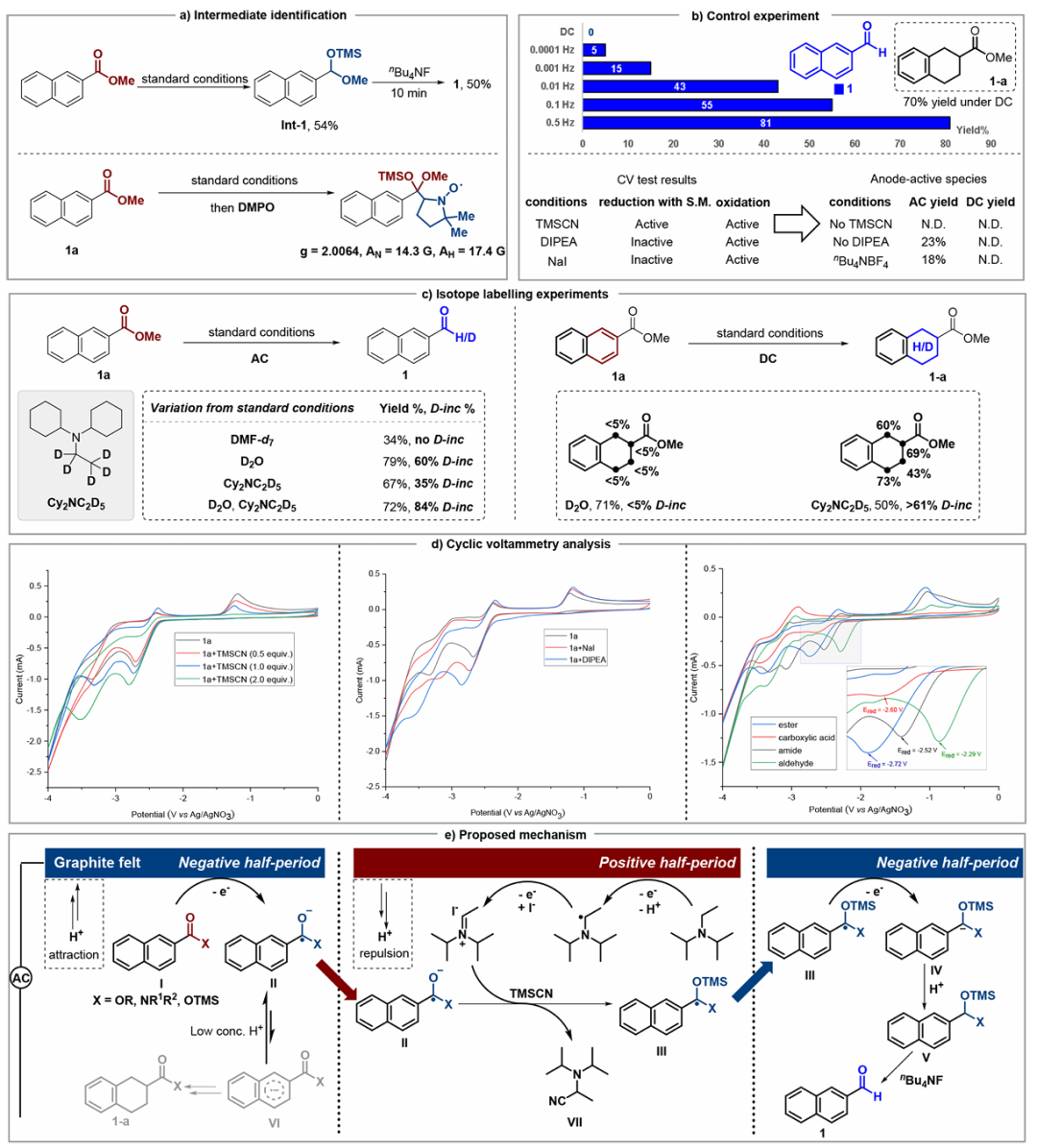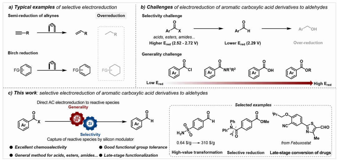 在选择性电还原技术的最新进展基础上,近日,周其林&仇友爱课题组报道了一种利用硅辅助的交流(AC)电还原策略,实现多种芳香族羧酸及其衍生物选择性转化为芳香醛的方法。