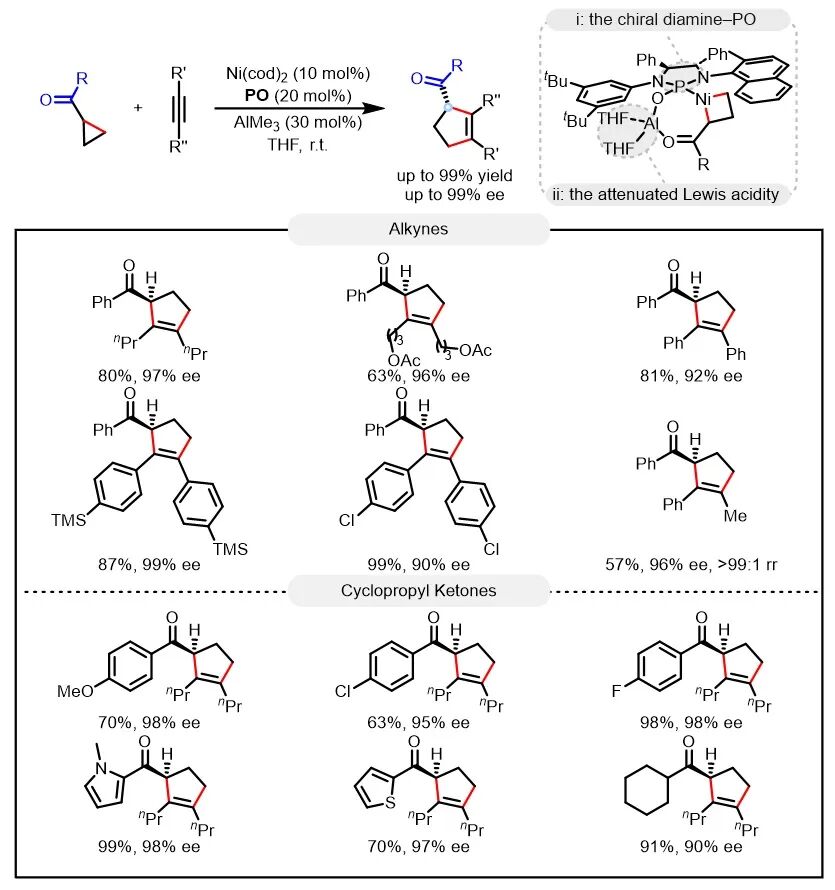 最近,南开大学叶萌春/徐魏魏团队提出了一种创新的催化策略:通过设计新型手性二胺-膦氧(PO)配体,获得了该类环加成反应活性的显著提升,可以使反应即使在室温下都可以高效进行,从而有效减弱了产物的消旋化。此外,引入弱配位的四氢呋喃(THF)溶剂,进一步降低Al中心的Lewis酸性,抑制产物的消旋化。最终,在温和条件下(室温),顺利实现了环丙基酮和炔烃的高对映选择性[3+2]环加成反应,不仅具有优异的底物普适性,而且能获得高达99%的收率和99%的对映选择性(图2)。机理研究表明,其高反应活性与立体选择性主要源于三个关键因素:新型PO配体的高活性,经PO/THF协同调控后适度减弱的Lewis酸性,以及温和的反应温度。这些因素的协同作用有效抑制了烯醇化介导的消旋路径,同时避免了酮羰基高亲电性引发的副反应。