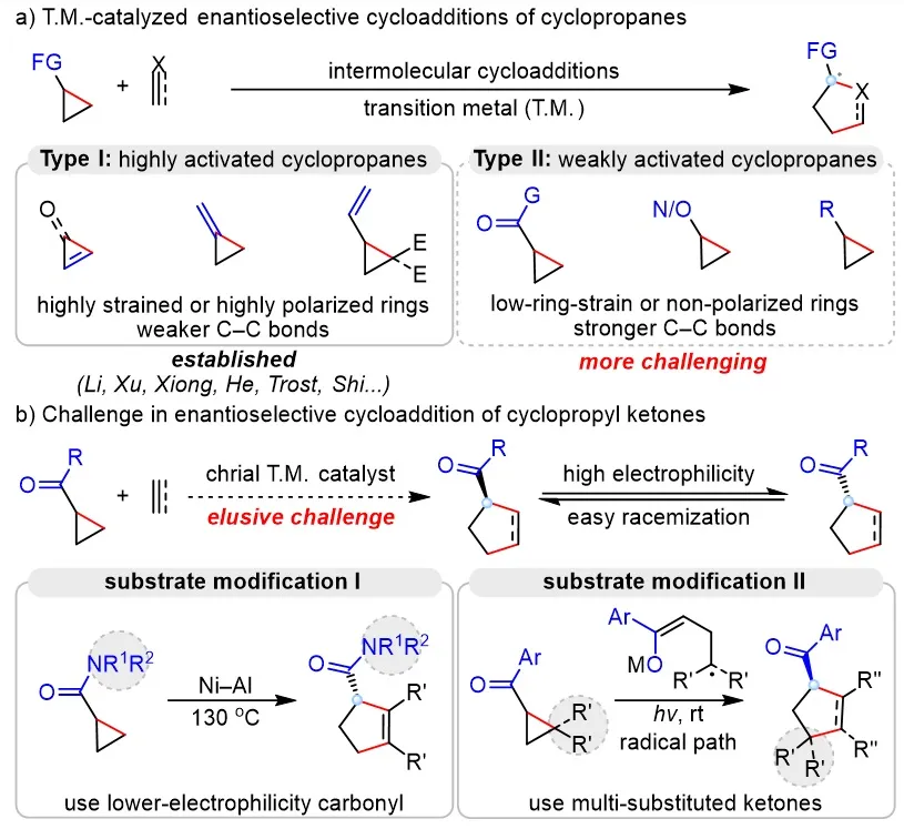 过渡金属催化的环丙烷与π-不饱和化合物的对映选择性环加成,是构建手性五元环状结构最为重要的方法。然而,由于环丙烷C–C键能较高,活化困难,已有的方法主要局限于含高环张力或强吸电子基团的环丙烷(图1a, Type I),难以应用于价廉易得且易于转化的环丙基酮类弱活化环丙烷(图1a, Type II)。高对映选择性环丙基酮的环加成反应的关键难点在于:酮羰基的亲电性较强,在C–C键断裂所需的高温或路易斯酸条件下,产物的手性α-叔碳中心难以稳定存在,容易发生外消旋化(图1b)。因此,自2006年以来,尽管环丙基酮消旋的环加成反应已有成功发展,但是高对映选择性版本一直难以实现。为了解决这一难题,一些底物修饰的方法被发展起来。例如,将酮替换为亲电性较弱的酰胺,可以在130 °C下,实现与炔烃的高对映选择性环加成(图1b左)。或者采用多取代环丙烷来稳定自由基中间体,发展温和条件下自由基型环加成反应(图1b右)。尽管这些方法可以实现高对映选择性的环加成反应,但是底物结构的特殊需求显著限制了产物的结构的多样性,导致反应的应用较为局限。因此,如何通过催化剂的调控,实现简单环丙基酮的高效不对称环加成反应是当前该领域亟待突破的关键挑战。