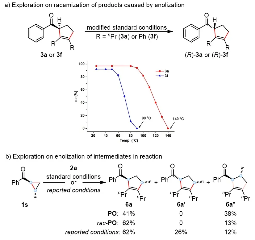 为深入验证该机理,该团队开展了一系列实验。首先考察了手性产物在不同温度下的稳定性:产物在室温下构型稳定,但随温度升高逐渐消旋(图3a)。进一步研究发现,在该催化体系中,无论使用手性或消旋PO配体,反应均专一地生成构型保持的产物(图3b)。这一结果与以往体系中常观测到构型翻转的现象形成鲜明对比,证实了PO/THF协同调控对Lewis酸性的削弱作用,以及该体系在温和条件下对中间体的稳定能力,从而同步实现了高活性与高对映选择性。
