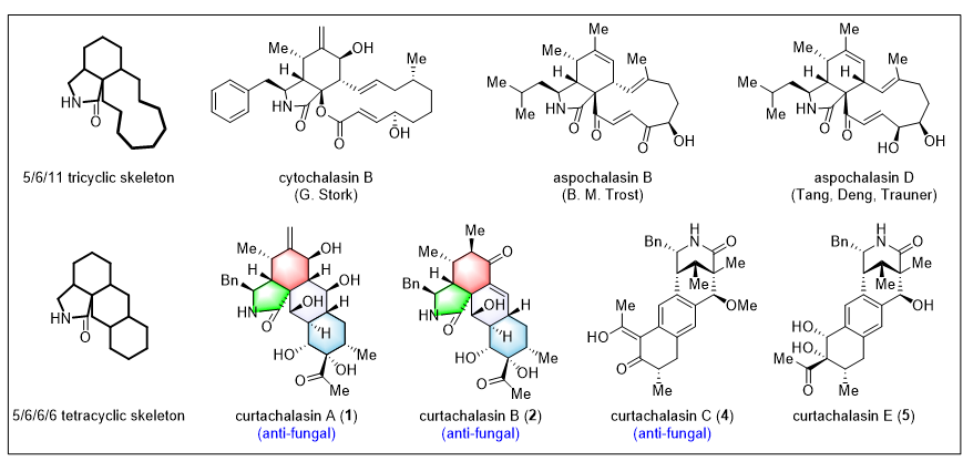细胞松弛素(Cytochalasans)是一大类含有异吲哚酮结构单元的聚酮类天然产物。由于它们能够与细胞内的肌动蛋白(actin)结合并抑制其聚合,细胞松弛素长期以来被广泛用作研究细胞骨架结构与动态调控的工具分子。与此同时,这一类天然产物还展现出多样的生物活性,包括免疫调节、细胞毒性以及杀线虫作用等。截至目前,已报道的细胞松弛素家族成员已超过500种。凭借其高度复杂的分子骨架与重要的生物学功能,细胞松弛素一直是天然产物化学合成与生物合成研究中的热点目标。国际上包括 Andrew Myers、Barry Trost、Dirk Trauner 等著名合成化学家,以及国内唐叶峰、张延东、邓军等多位研究团队,都曾在这一领域开展系统研究(图1)。
