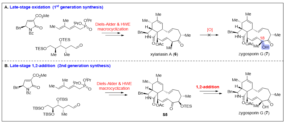 研究团队首先设计了三种模块化片段,通过分子间 Diels–Alder 反应与分子内 Horner–Wadsworth–Emmons(HWE)反应,成功构建了三环细胞松弛素中间体 xylariasin A。作者推测在该类天然产物生物合成过程中:xylariasin A经历C-18位氧化即可转化为关键前体zygosporin G。然而,由于11元大环特有的环张力效应,这一看似简单的氧化转化在化学体系中始终难以实现。为此,研究团队设计了第二代合成路线:通过后期的甲基加成策略,间接引入所需的C-18位三级醇。该策略进展顺利,使研究者能够以克级规模制备zygosporin G,为后续仿生转化奠定了坚实基础(图2)。