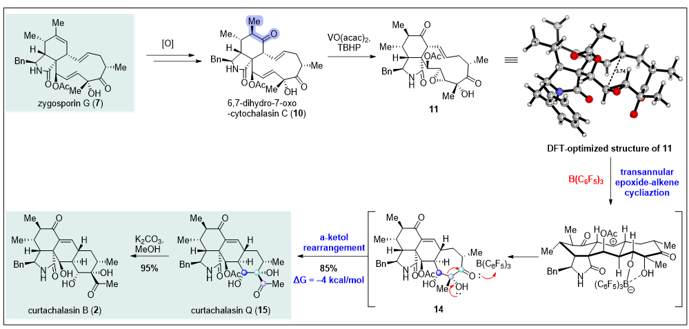 在获得zygosporin G后,研究团队开展了其向Curtachalasin B的仿生转化研究(图3)。通过环氧化及BF₃·Et₂O促进的半频哪醇重排,研究者首先调节分子的氧化态,获得了关键中间体6,7-dihydro-7-oxo-cytochalasin C(10),随后进一步引入C19–C20环氧,构建了跨环重排所需的前体11。这一过程的核心挑战在于:1) 精准控制环氧开环的区域与立体选择性;2) 调控不同碳正离子中间体的反应路径与终止方式。在系统筛选多种Brønsted/Lewis 酸及溶剂条件后,研究团队发现:体积庞大的B(C6F5)3能够高效触发跨环烯烃环化,并串联推动α-酮醇重排,从而一步实现 (5/6/6/6) 四环骨架的构建。最终,经简单脱乙酰操作,研究者顺利获得了Curtachalasin B。
