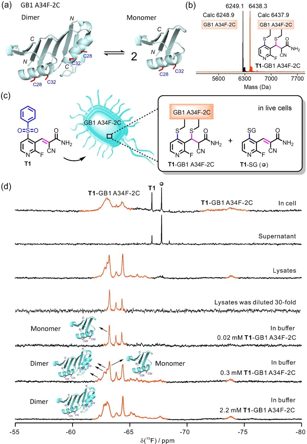 该研究证实,T1能有效穿透大肠杆菌及哺乳动物HEK293T细胞膜,在活细胞内实现对目标蛋白质(POI-2C)的高效、位点特异性标记。19F NMR分析显示,T1在大肠杆菌中对POI-2C的标记效率接近100%,在HEK293T细胞中亦可达76%,且该标记对细胞无毒,这对活细胞检测至关重要。该策略条件温和、操作简便,实验中获得的19F-NMR信号清晰可辨,为在活细胞生理环境下进行蛋白质的高分辨率研究提供了有力工具(图5)。
