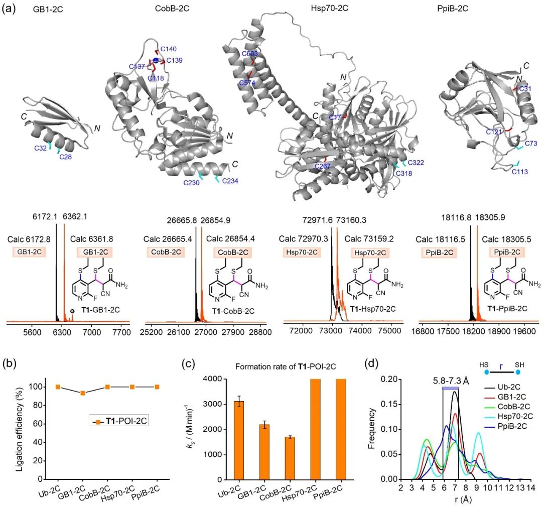 RAT-NGP策略对蛋白质标记的普适性,通过用一系列分子量差异明显(6-73 kDa)且含有不同数目的天然半胱氨酸的蛋白质进行验证,这些蛋白质包括没有内源半胱氨酸的和有多个半胱氨酸或锌指结构域的蛋白质(图4a)。结果表明,无论目标蛋白质是否含有内源性半胱氨酸,标签T1均能高效(效率≥93%),快速且特异性地与工程化的双半胱氨酸位点反应,而天然半胱氨酸或锌指结构域则完全不受影响,并且人工构建的两个半胱氨酸不但可以在螺旋有序结构区,也可以在柔性较大的环区(loop region)。分子动力学模拟进一步揭示,目标蛋白中的两个半胱氨酸残基之间的硫原子距离在5.8到7.3 Å之间,适合RAT-NGP标记反应。这些结果证明了该策略在不同大小、不同半胱氨酸背景的蛋白质中进行位点特异性修饰的广泛适用性和高效性(图4)。