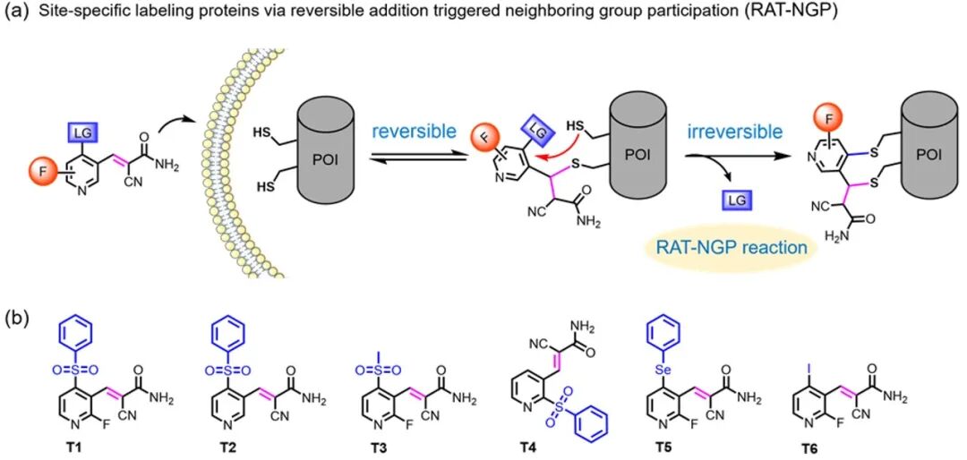 针对上述问题,南开大学苏循成教授课题组发展了一种在活细胞内的“可逆加成反应触发的邻基参与”(RAT-NGP)化学反应定点标记蛋白质的方法。该标记化学策略基于一种反应性小分子标签,通过两步连续反应与目标蛋白质(POI-2C)上两个工程改造的、溶剂可及的半胱氨酸残基发生作用。每个功能标签分子含有两个活性基团,其中一个为与游离硫醇可逆反应的Michael受体,另一个则是对硫醇具有特异性反应的可离去基团(LG)。相较于可逆的Michael受体,离去基团对游离硫醇的反应性较低且可调节。在POI-2C中,两个半胱氨酸残基的侧链巯基在空间上具有一定的距离(通常在5-7 Å)。首先,一个游离巯基通过可逆的Michael加成反应与标签分子连接,第一步反应使得标签中的可离去基团(LG)与蛋白质中的另一个巯基更为接近,从而促进巯基对LG的亲核取代反应。第二步反应类似于有机合成中的邻基参与(NGP)反应,在合适的空间距离范围内,两个蛋白质巯基通过级联反应与标签连接,从而实现目标蛋白质的定点标记。该策略的独特之处在于,可逆的Michael加成反应触发了NGP效应,NGP反应进一步稳定了可逆加成产物(见图1),同时有效避免了单一自由巯基的影响,从而实现目标蛋白质的定点标记。
