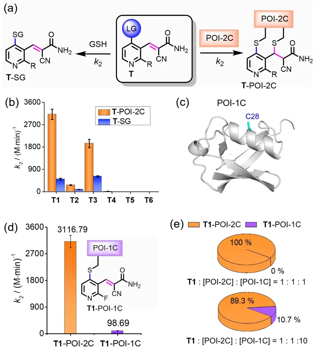 鉴于GSH在细胞内高度丰富且其反应性与溶剂可及的蛋白质巯基相似,作者评估了RAT-NGP标签(T1-T6)对POI-2C相对于GSH的选择性。结果显示,T1对POI-2C的选择性最佳,因而被选为后续研究的功能标签。为了进一步研究RAT-NGP效应对目标蛋白质标记选择性的影响,作者比较了T1对POI-2C(Ub E24C/A28C)和POI-1C(Ub A28C)的反应,发现T1与POI-2C的反应活性比POI-1C高出30倍。这些数据表明邻基参与效应极大地加速了后续不可逆的亲核取代反应。在POI-2C和POI-1C之间的竞争反应中,T1显示出对POI-2C的强烈偏好,甚至在POI-1C过量存在时,T1几乎全部与POI-2C反应。表明RAT-NGP反应对POI-2C相对于GSH和POI-1C具有高选择性(图3)。
